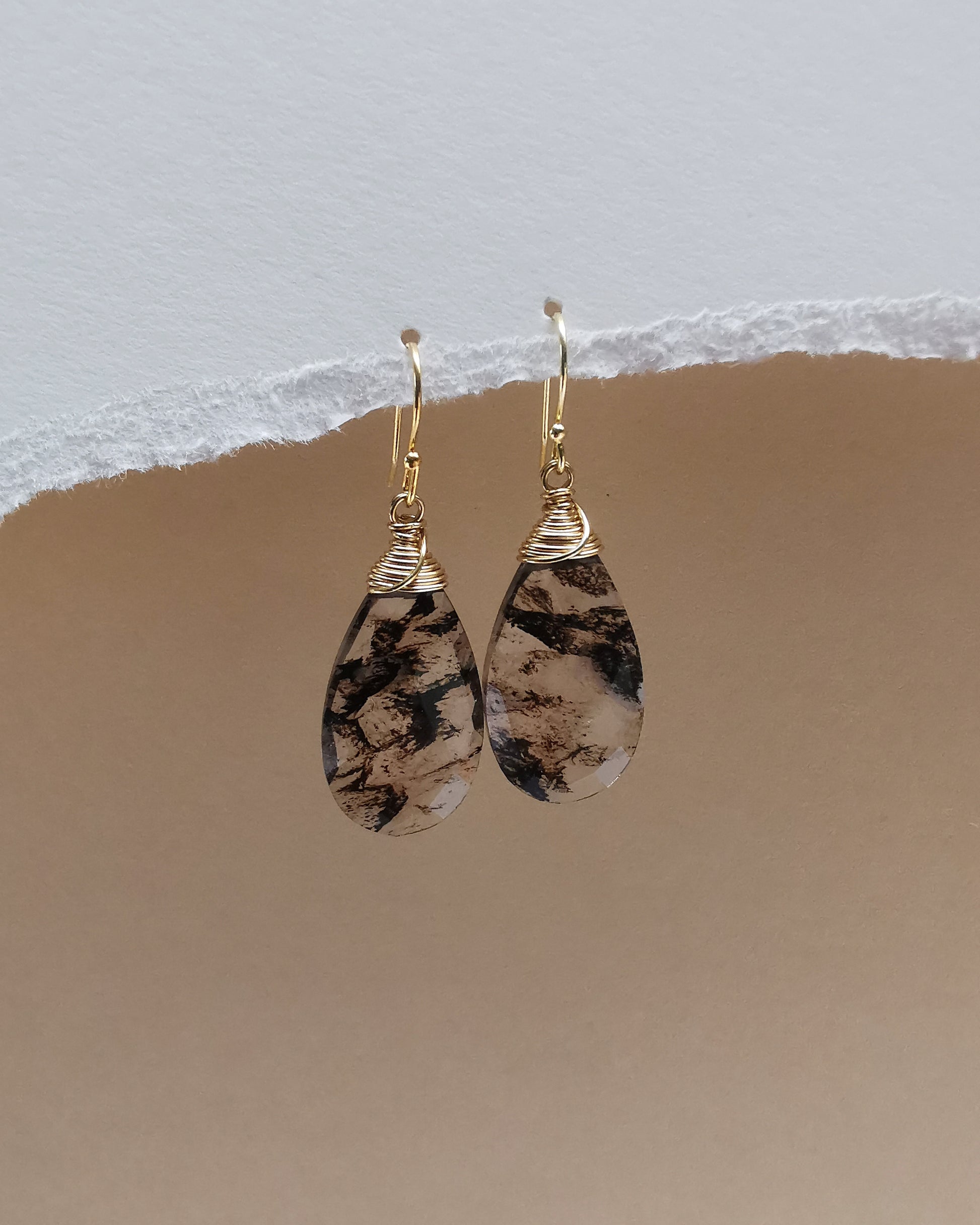These captivating earrings showcase black infused quartz teardrops, each stone marked with mesmerizing natural inclusions that give them incredible character. Hand-wrapped in 18k gold-plated wire and paired with sterling silver ear hooks, they carry an earthy beauty that feels personal and expressive. A wonderful choice for shoppers searching for black infused quartz earrings, artisan gemstone drops, and pieces that highlight the natural charm within every crystal.