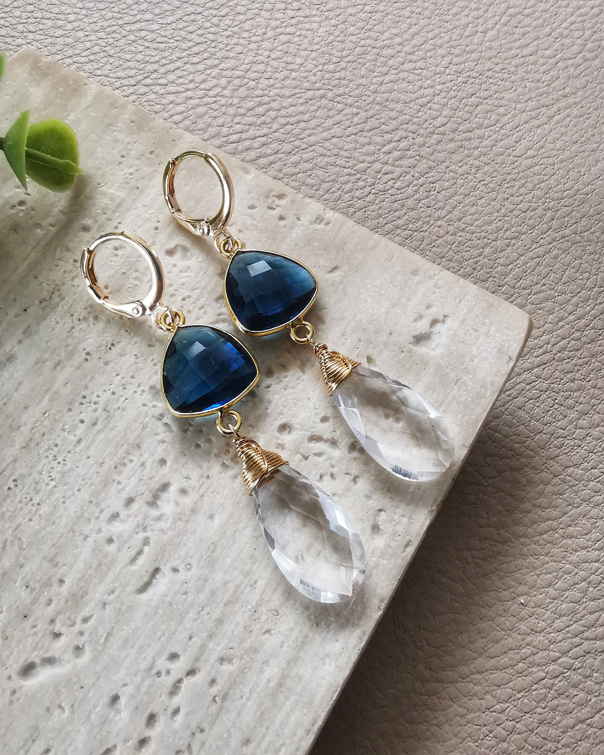 These london blue topaz and clear quartz drop earrings radiate calm elegance and luminous clarity. A trillion-cut london blue topaz gemstone rests in a delicate bezel setting, showcasing its deep indigo hue. Dangling beneath is a wire-wrapped clear quartz teardrop, adding brilliance and movement to the design.