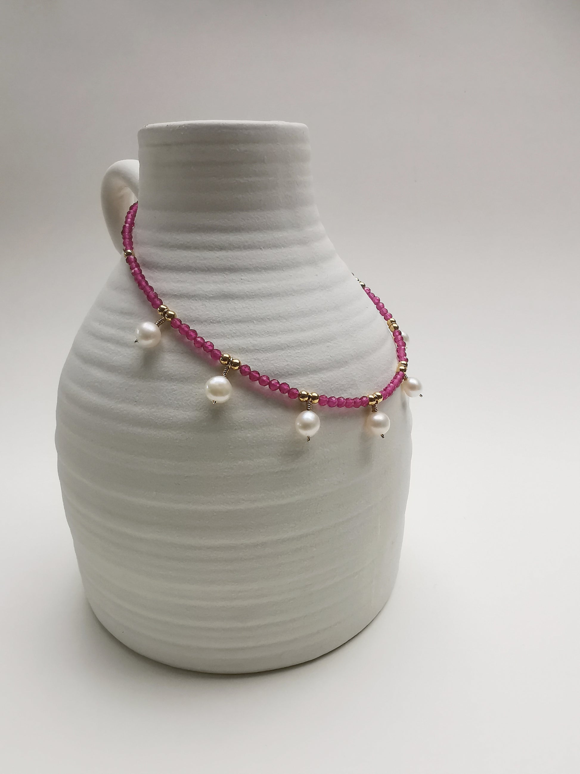 Add a soft, elegant touch to your everyday look with this handcrafted necklace featuring vibrant pink tourmaline beads and seven dangling freshwater pearls. The bright pink gemstone tones and subtle shimmer make it perfect for layering, gifting, or wearing as a standout piece on its own.