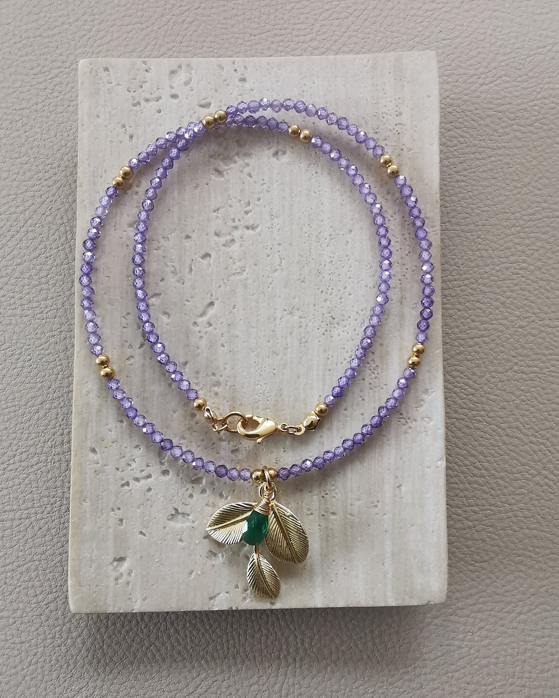 Inspired by our popular Olivia earrings, this olive leaf bead necklace features a delicate three-leaf olive branch pendant adorned with a wire-wrapped gemstone for a touch of natural elegance. The beaded chain adds texture and charm, making this necklace a beautiful statement piece for everyday wear or special occasions. Symbolizing peace and harmony, the olive leaf design pairs perfectly with the gemstone’s subtle sparkle. Wear it alone for a minimalist look or style it with our matching Olivia earrings for a coordinated jewellery set.
