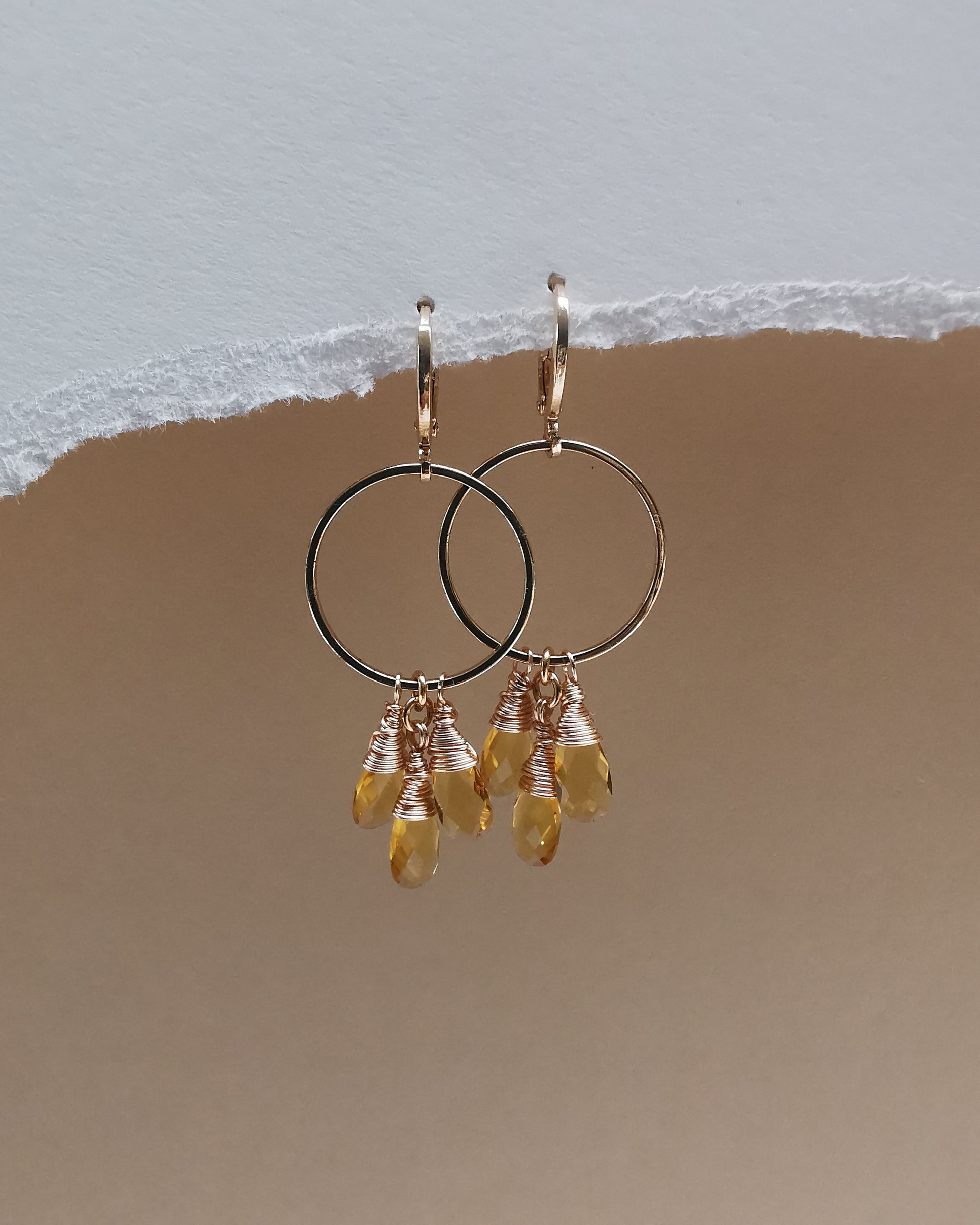 Warm and cheerful, these hoops showcase three glowing citrine teardrop gemstones, each wire-wrapped with care and arranged to sway beautifully as you move. Their sunny sparkle brings brightness to casual outfits and adds a golden touch to your everyday style. Perfect for anyone looking for citrine earrings, yellow gemstone hoops, or jewelry that brings a little light to every moment.