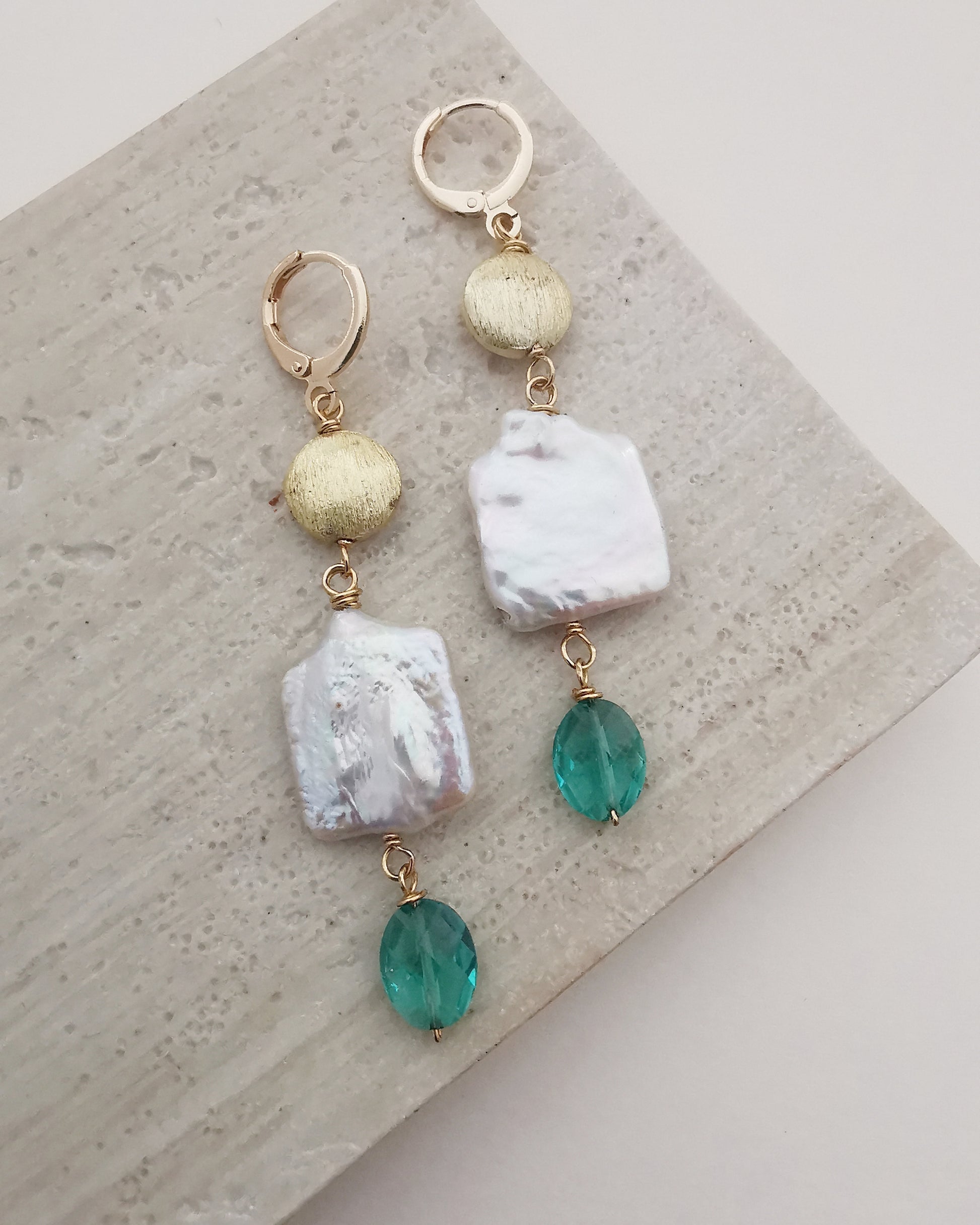 These handcrafted earrings combine rich textures and natural elements for a sophisticated, one-of-a-kind design. A gold brushed coin bead anchors the composition, paired with a luminous square baroque pearl that showcases its organic beauty. A touch of Caribbean green iolite adds a hint of colour and sparkle, creating a refined balance of elegance and modern style. Ideal for weddings, special events, or elevating everyday looks, these earrings are perfect for those who appreciate artisan craftsmanship and distinctive gemstone combinations.