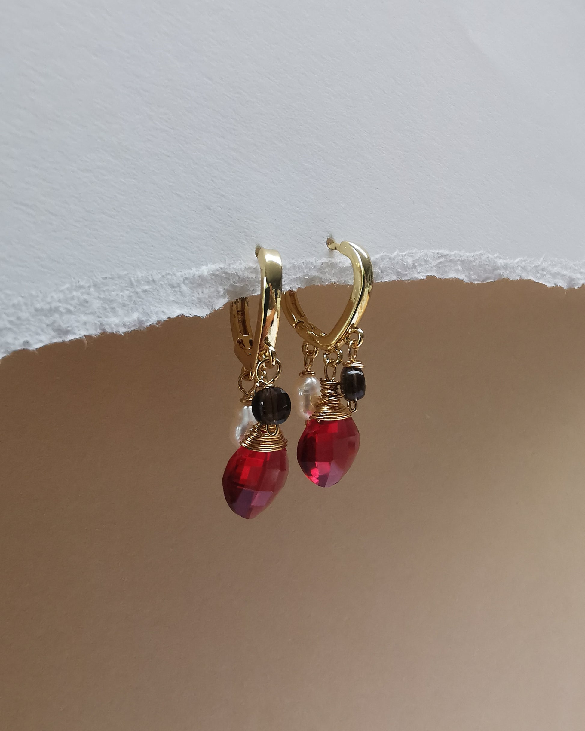 These elegant marquise huggie hoops feature three dangling gemstones, pearls, red quartz, and tiny smoky quartz, bringing together a beautiful blend of glow, colour, and depth. The lively red quartz adds a spark of energy, the pearls bring softness, and the smoky quartz grounds the design with subtle warmth. Ideal for those searching for red quartz earrings, pearl hoops, smoky quartz jewellery, and gemstone styles that transition easily from day to night.