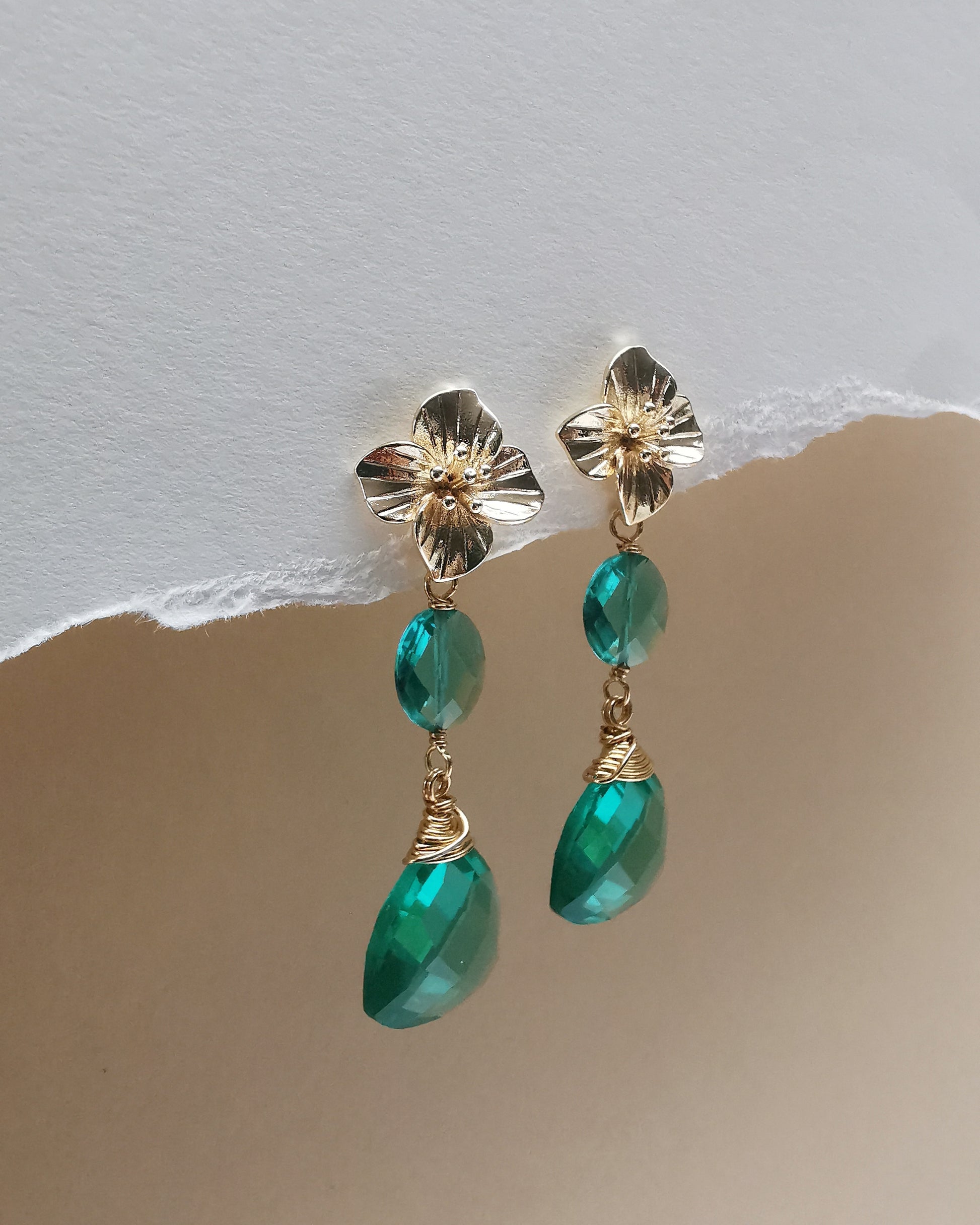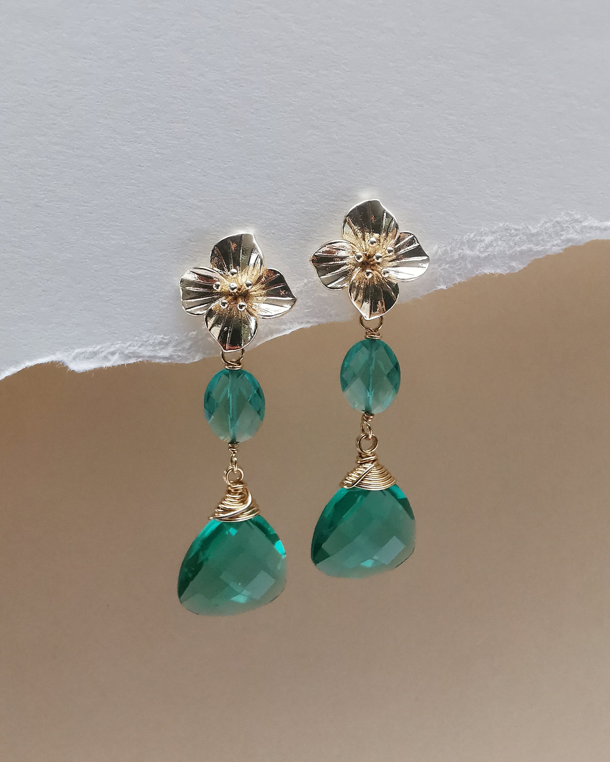 The soft green tones and botanical design make these earrings ideal for wedding jewellery, garden-party outfits, bridesmaids, or any moment that calls for a romantic, gemstone-rich touch.