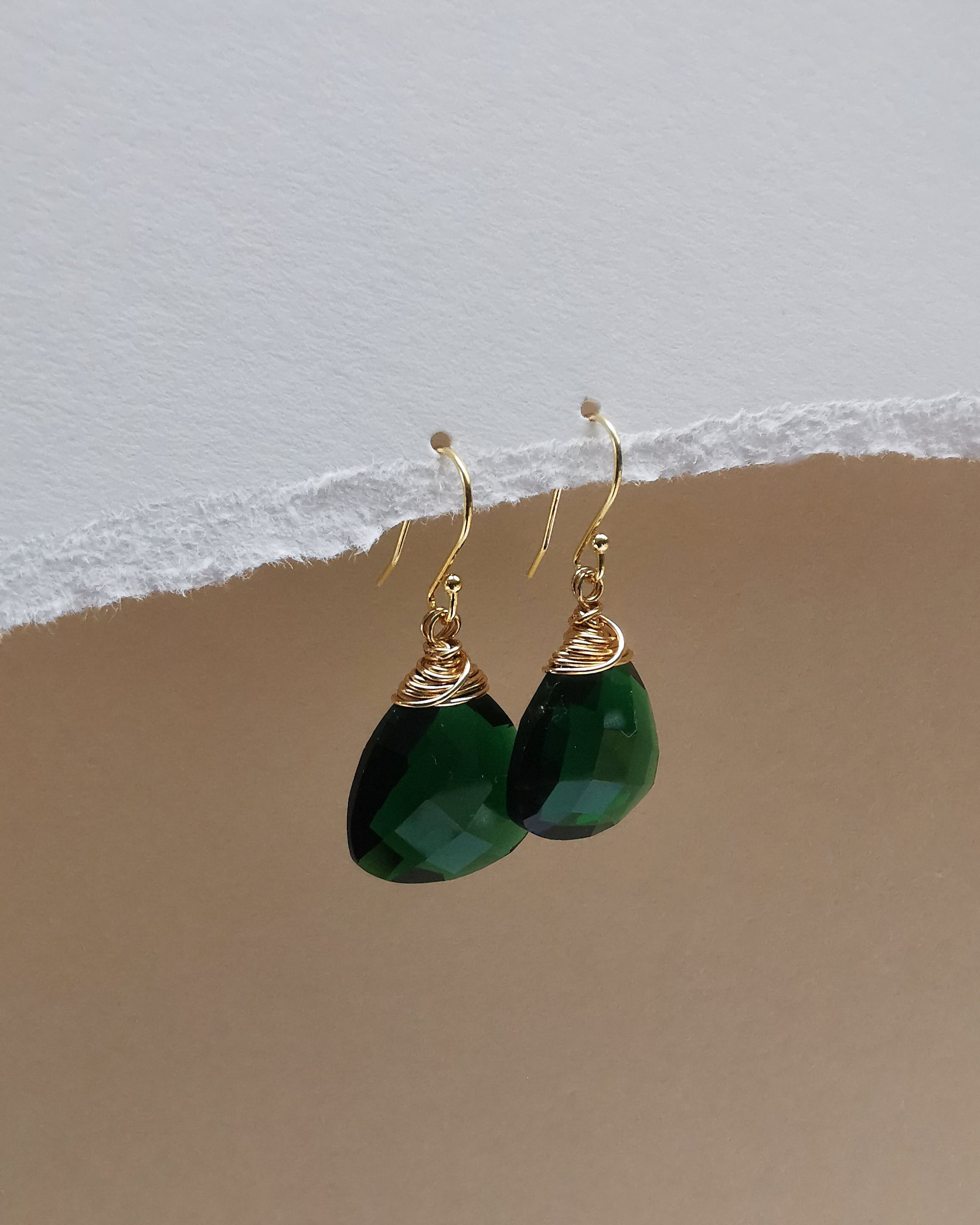 These fresh and luminous earrings feature a glowing emerald quartz trillion gemstone, wrapped by hand with 18k gold-plated wire and set on a sterling silver ear hook. Their sparkling green hue brings a refreshing lift to your everyday style while maintaining a polished, graceful feel. A beautiful option for anyone drawn to green gemstone earrings, emerald quartz jewellery, and delicate pieces with a bright, uplifting presence.