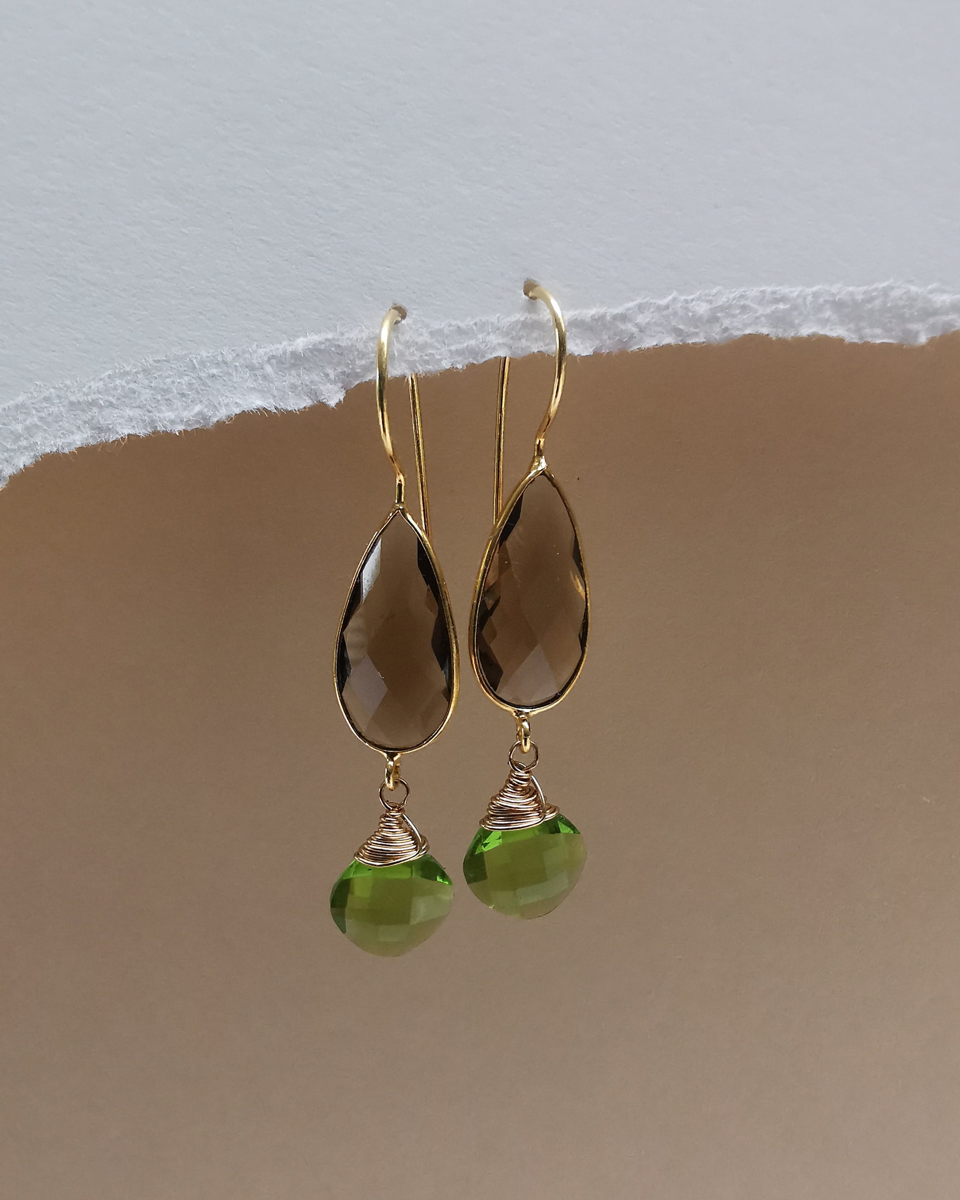 These elegant smoky quartz long drops pair earthy richness with the refreshing brightness of peridot, hand-wrapped in gold-plated wire. The bezel-set teardrop doubles as a delicate ear hoop, creating soft movement and an inviting glow that feels calm, grounded, and beautifully balanced.